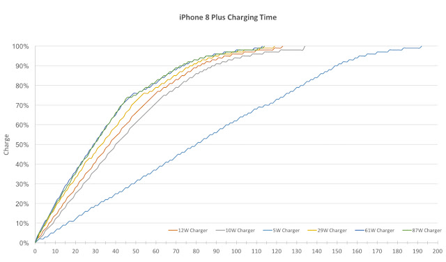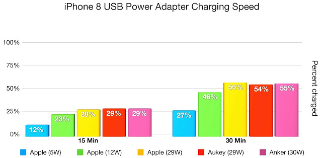 由下圖能看到,原廠附的5W充電器給iPhone 8充電,15分鐘只能回血12%、30分鐘回血27%。使用12W的iPad充電器15分鐘回血23%、30分鐘回血46%。官方推薦的29W充電15分鐘回血28%、充電30分鐘回血56%,比蘋果宣稱的充電速度更快。